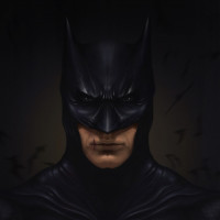 a dynamic pose with a stern expression on his face, which is characteristic of the iconic superhero portrayed by many actors across different adaptations. The background suggests a dark or grim setting, fitting the theme of
