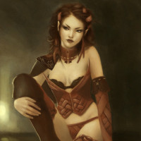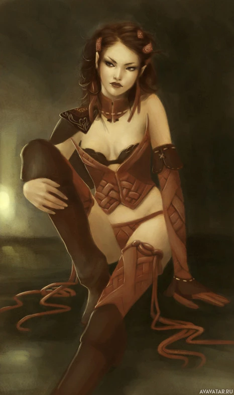 a non-human race or a different plane of existence. She's wearing armor and attire that give off a somewhat gothic or fantasy aesthetic, which is common in fantasy artwork. The setting appears to be a dimly