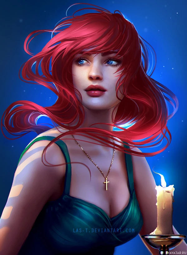 На картинке изображена стилизованная иллюстрация женщины с рыжими волосами. Она, кажется, смотрит вдаль, и на заднем плане видны свечи. Общая атмосфера — это созерцание или самоанализ.