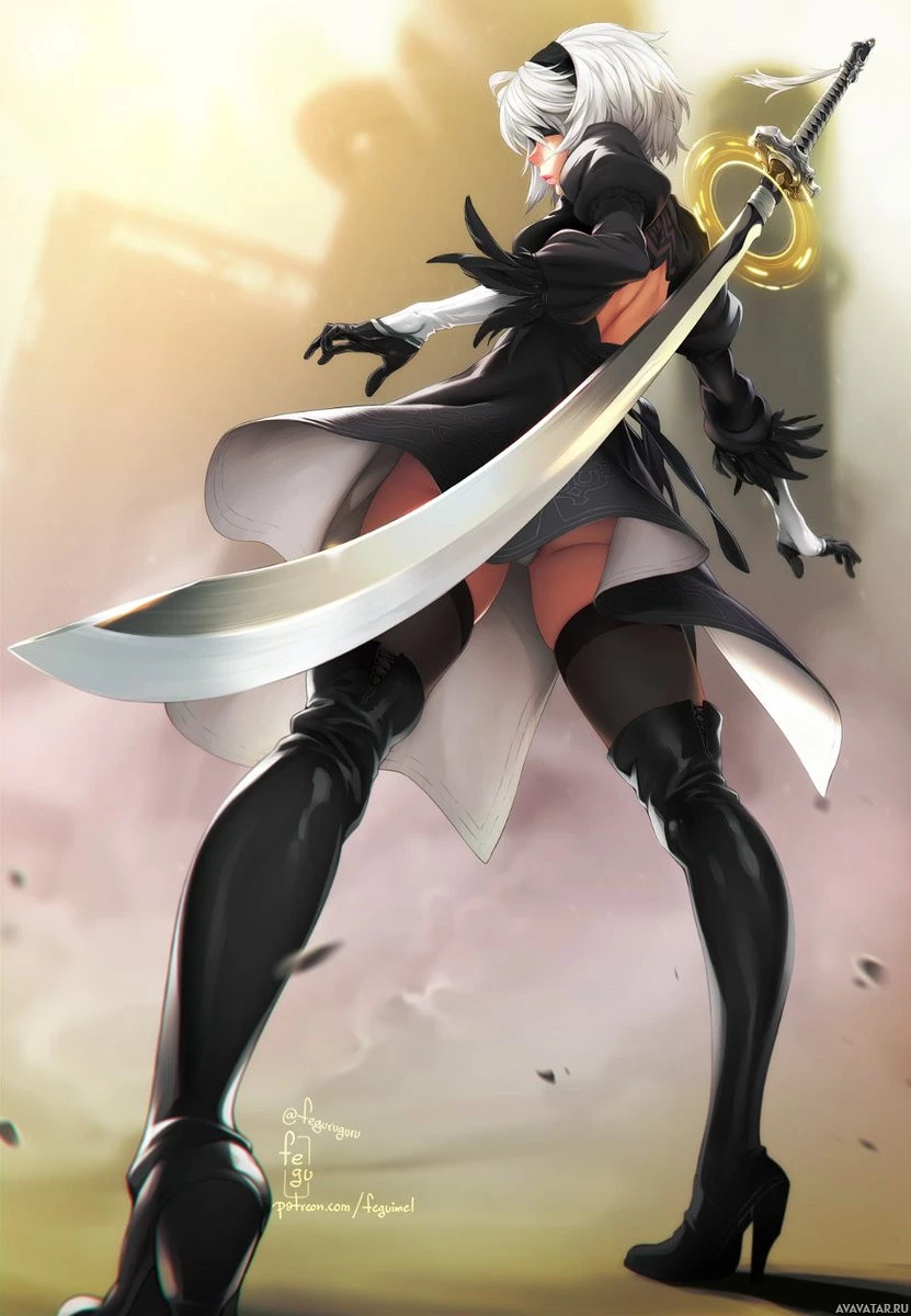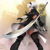 the video game "Nier: Automata." The character is depicted holding a sword and has