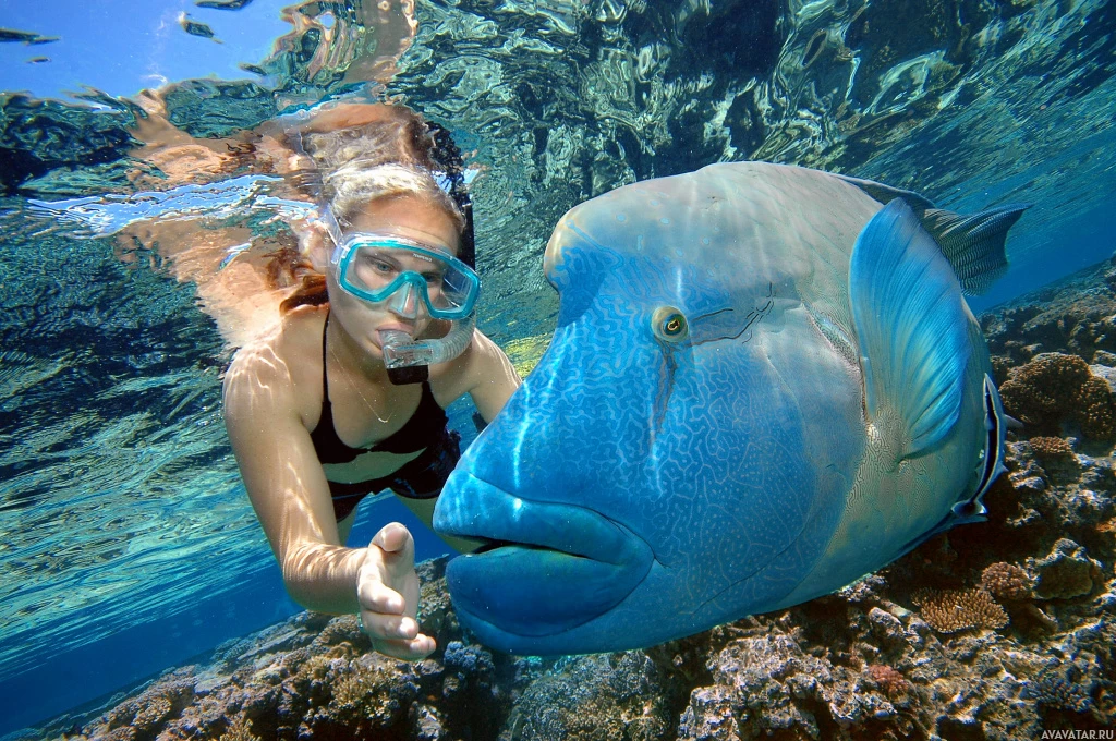 scuba gear interacting with a blue fish underwater. The girl appears to be feeding the fish, which is likely a type of