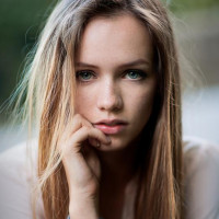 На картине изображена молодая женщина со светлыми волосами, задумчиво позирующая. Она, кажется, носит макияж и имеет браслет на правом запястье. Ее губы слегка расставлены, и она упирается подбородком в руку, предлагая момент созерцания или мечтания. Фон не в фокусе, но кажется, что это наружная обстановка с видимыми деревьями.