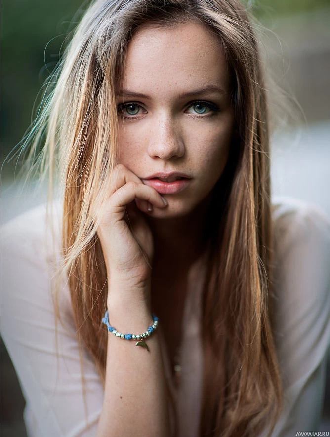 The picture shows a young woman with light hair, posing thoughtfully. She appears to be wearing makeup and has a bracelet on her right wrist. Her lips are slightly parted, and she is resting her chin on her hand, suggesting a moment of contemplation or daydreaming. The background is out of focus but it seems to be an outdoor setting with trees visible.