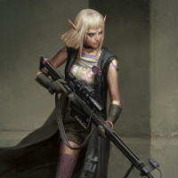 a utility belt or harness. Her attire suggests she might be a fantasy-themed mercenary or adventurer. The setting looks like