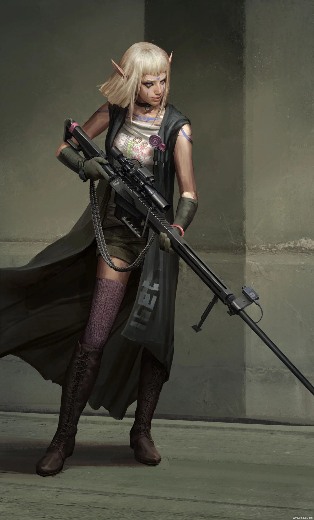 female character. She is holding a rifle and has various accessories, such as gloves, boots, and what appears to be