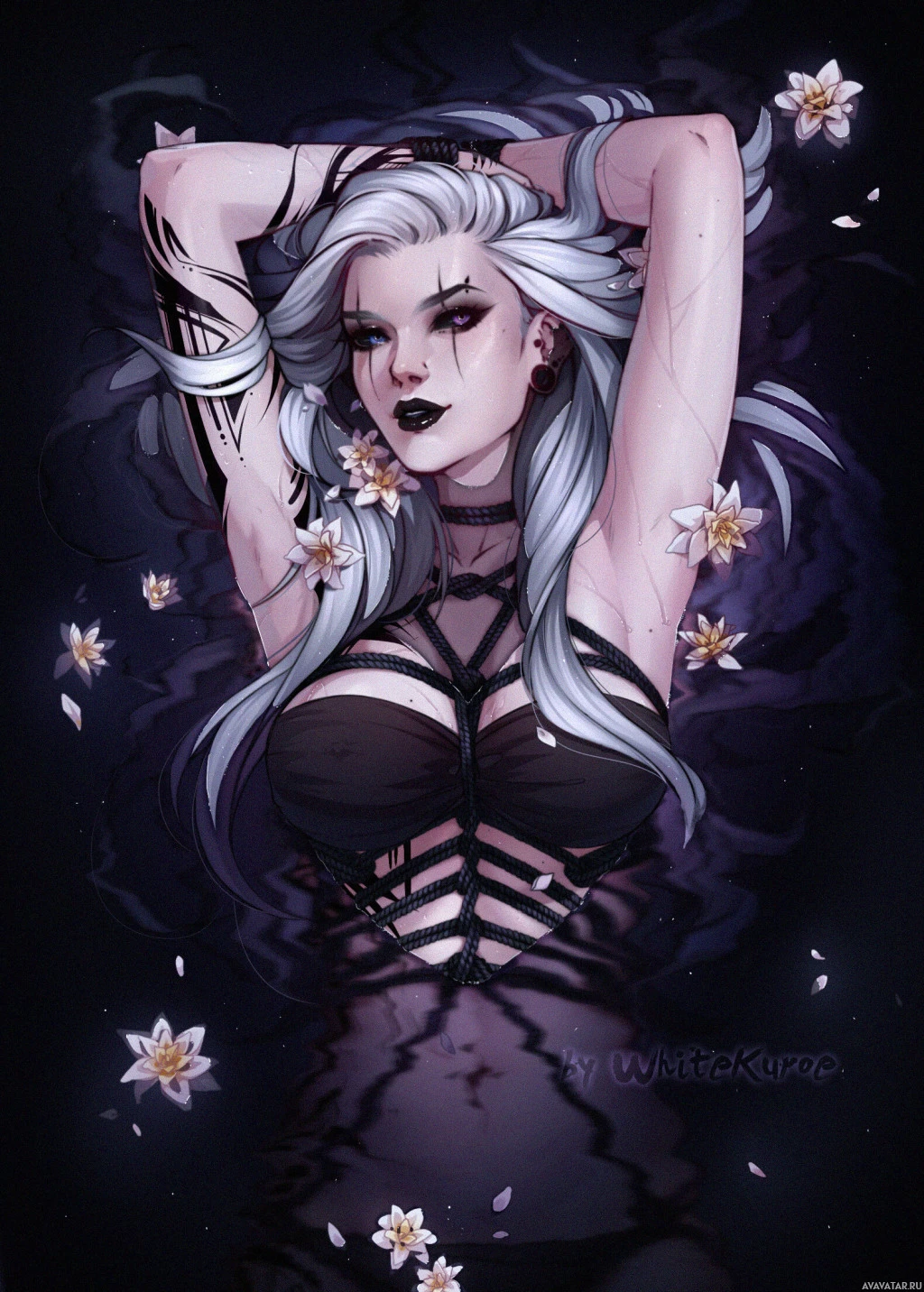 white accents, suggesting a gothic or dark aesthetic. The background features water that reflects light, possibly indicating