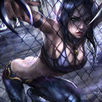 dark hair and her expression conveys intensity or anger. The character is standing behind what appears to be a chain
