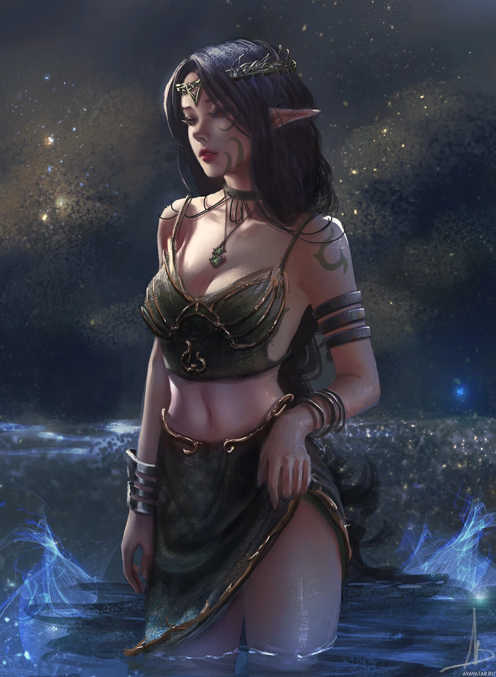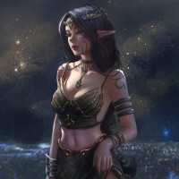 an elf character. She is wearing a fantasy-style outfit with elements that suggest a medieval or fantastical theme, such as armor and jewelry that could be typical of