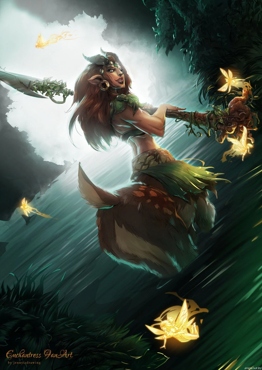 The image depicts a fantasy character, an Enchantress from the game Dota 2. She is shown in a dynamic pose with a staff and what appears to be magical energy surrounding her hands. Her attire includes traditional elements that suggest she might have some sort of enchanter role or ability within the game. The background features misty greenery, which adds to the mystical atmosphere of the image.
