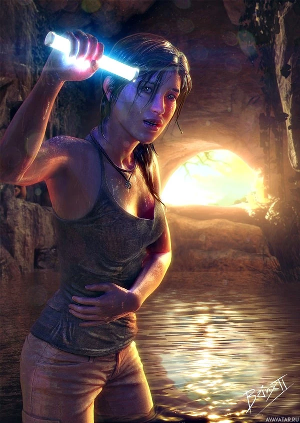 game series, Lara Croft. She is depicted in an action pose with one hand holding what appears to be a torch, suggesting she might be exploring or navigating through a cave or