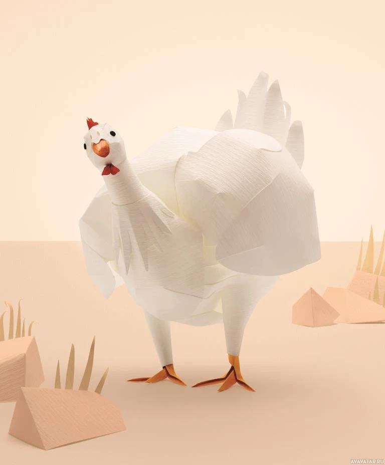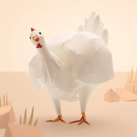 a craft project, featuring a rooster made from paper. The craft is designed to resemble a realistic chicken with details such as feathers and a prominent comb. The rooster stands on what appears to be sand, with small rocks scattered around it, suggesting a desert or