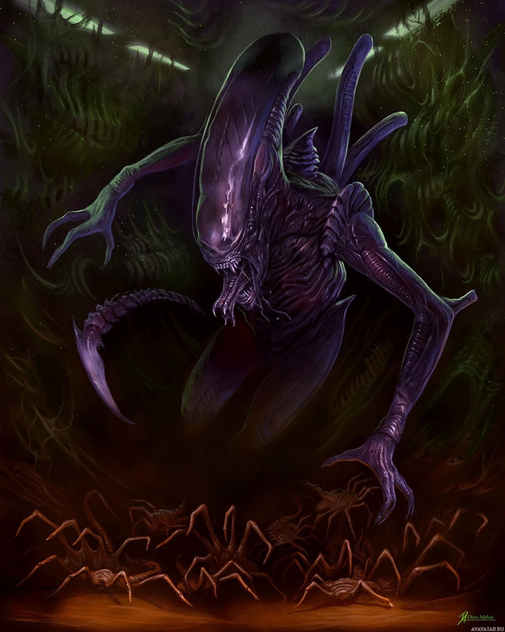 alien creature from the "Aliens" movie franchise. It is shown in its signature form with two long legs, elongated neck, and