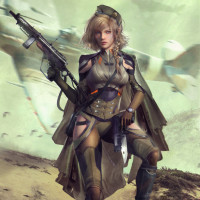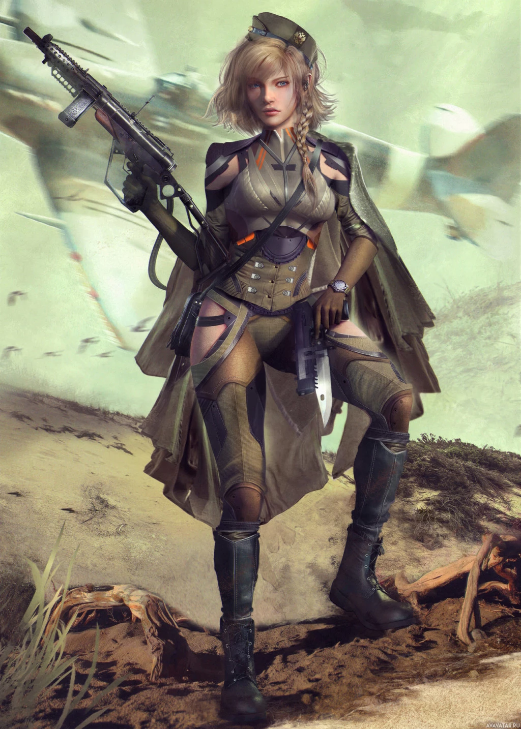 На картинке изображена женщина, одетая в то, что выглядит как наряд в военном стиле, с камуфляжными узорами и с винтовкой. У нее светлые волосы и она стоит на поле боя или в раздираемой войной обстановке. На заднем плане есть летающие транспортные средства или самолеты, которые предлагают передовую технологическую обстановку для истории персонажа.