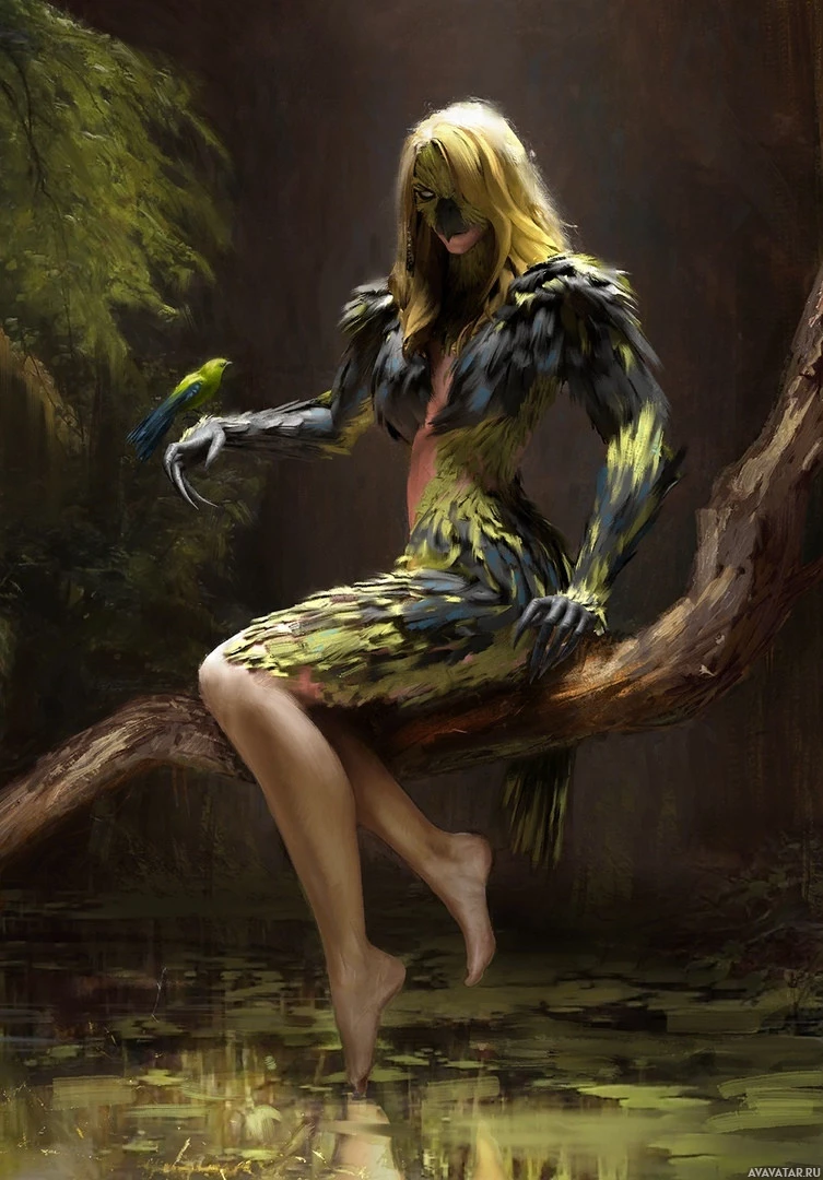 human form. She is sitting on a branch and appears to be surrounded by nature, which could suggest a scene from the game where she might have transformed into a bird for some purpose, such as escaping danger or enhancing her abilities temporarily. The character is known for her