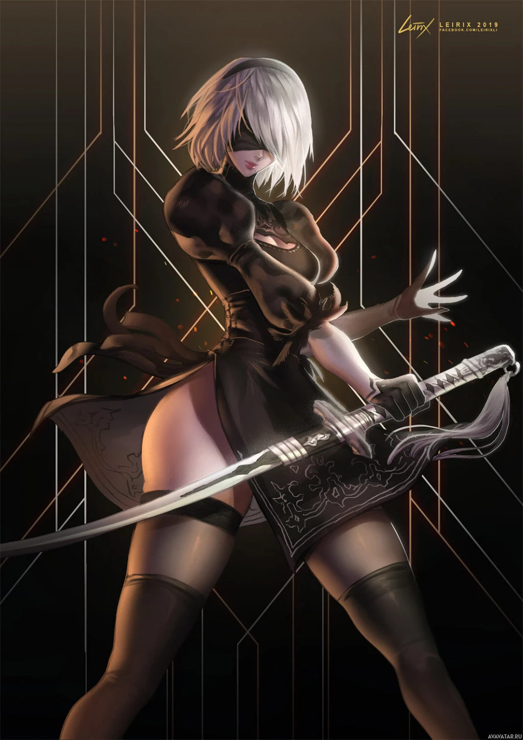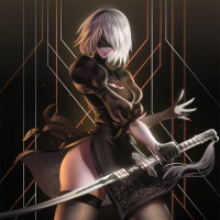 a dynamic pose, holding what appears to be a sword or similar weapon with both hands. She is wearing armor and has her legs spread apart, showcasing her stance as if she's ready for combat. The background features geometric shapes that give the impression of