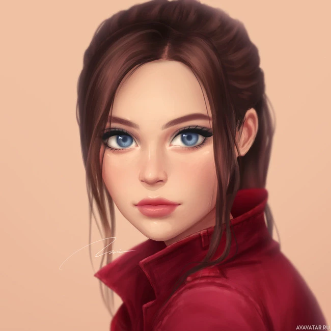 blue eyes, brown hair tied back in a high ponytail, and is wearing what appears to be a red jacket or coat with the collar up. The artwork showcases a realistic style with attention to detail, particularly in the rendering of her facial features and hair texture.