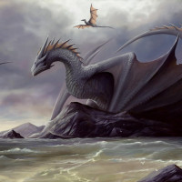 a fantasy scene featuring a dragon. The dragon is shown in profile, with its wings extended, possibly flying or preparing to take off. It appears to be perched on rocks near the ocean, which could indicate that it's
