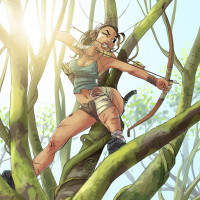 a female character climbing up the side of a tree. She is holding onto the branches with one hand and has a bow in her other hand, suggesting she might be preparing to use it or just returning from an adventure involving archery. Her attire and style suggest she could be inspired by Lara Croft from
