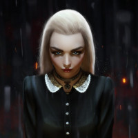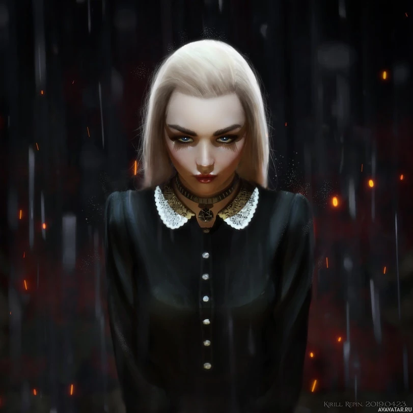 a black outfit and appears to be standing in the rain or facing an ominous situation, given the dark ambiance and the fiery background. The character's expression is serious or concerned, and she seems to be looking off to the side rather than directly at the viewer.
