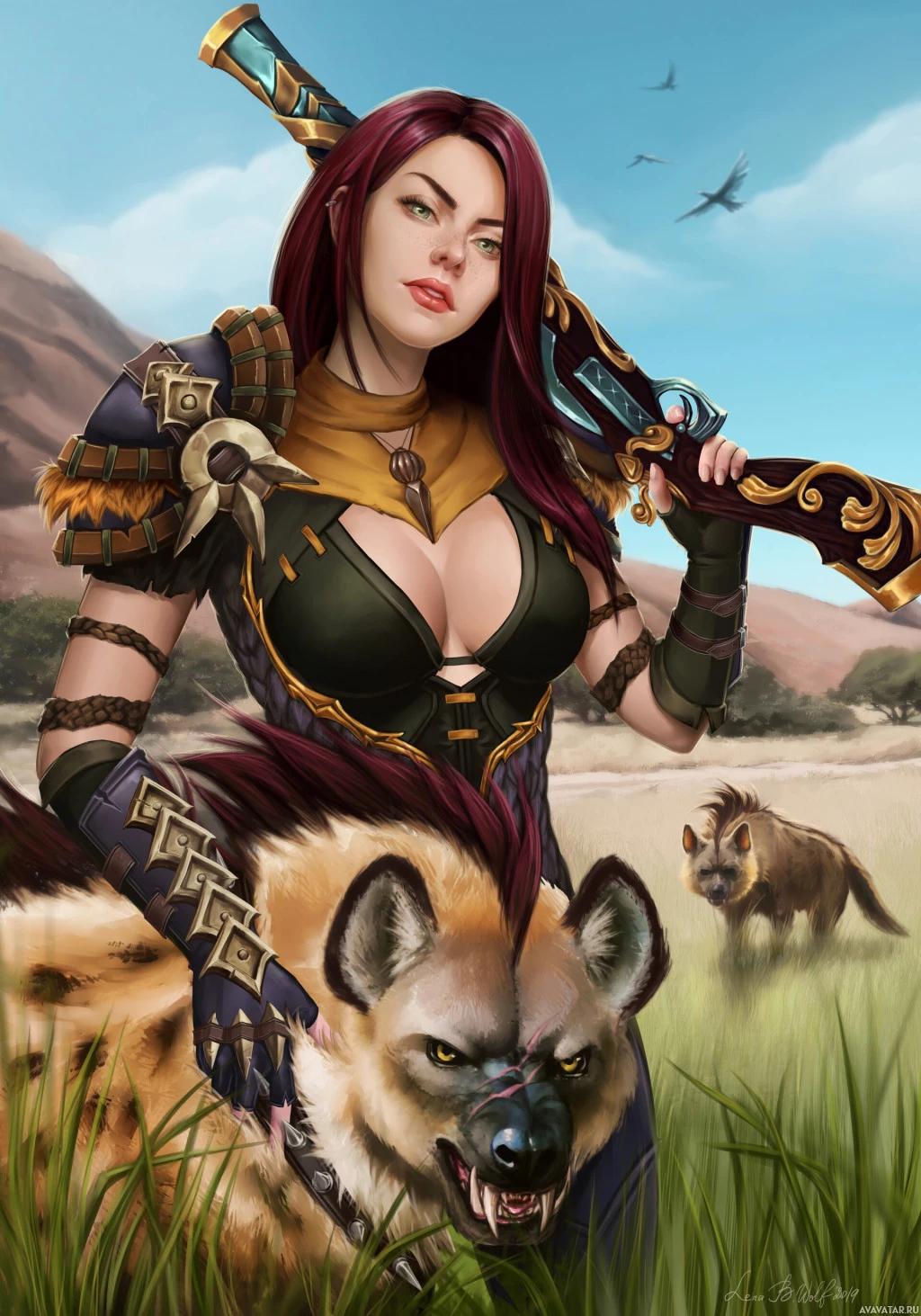 На картинке изображен женский персонаж с рыжими волосами, одетый в доспехи и держащий то, что кажется луком. Ее сопровождает большое волчье существо. Есть и другие существа на заднем плане, которые похожи на волков или диких собак. Эта иллюстрация предполагает, что персонаж может быть частью жанра фэнтези или приключений. Броня указывает на потенциальную роль воина, лучника или исследователя в этой обстановке.