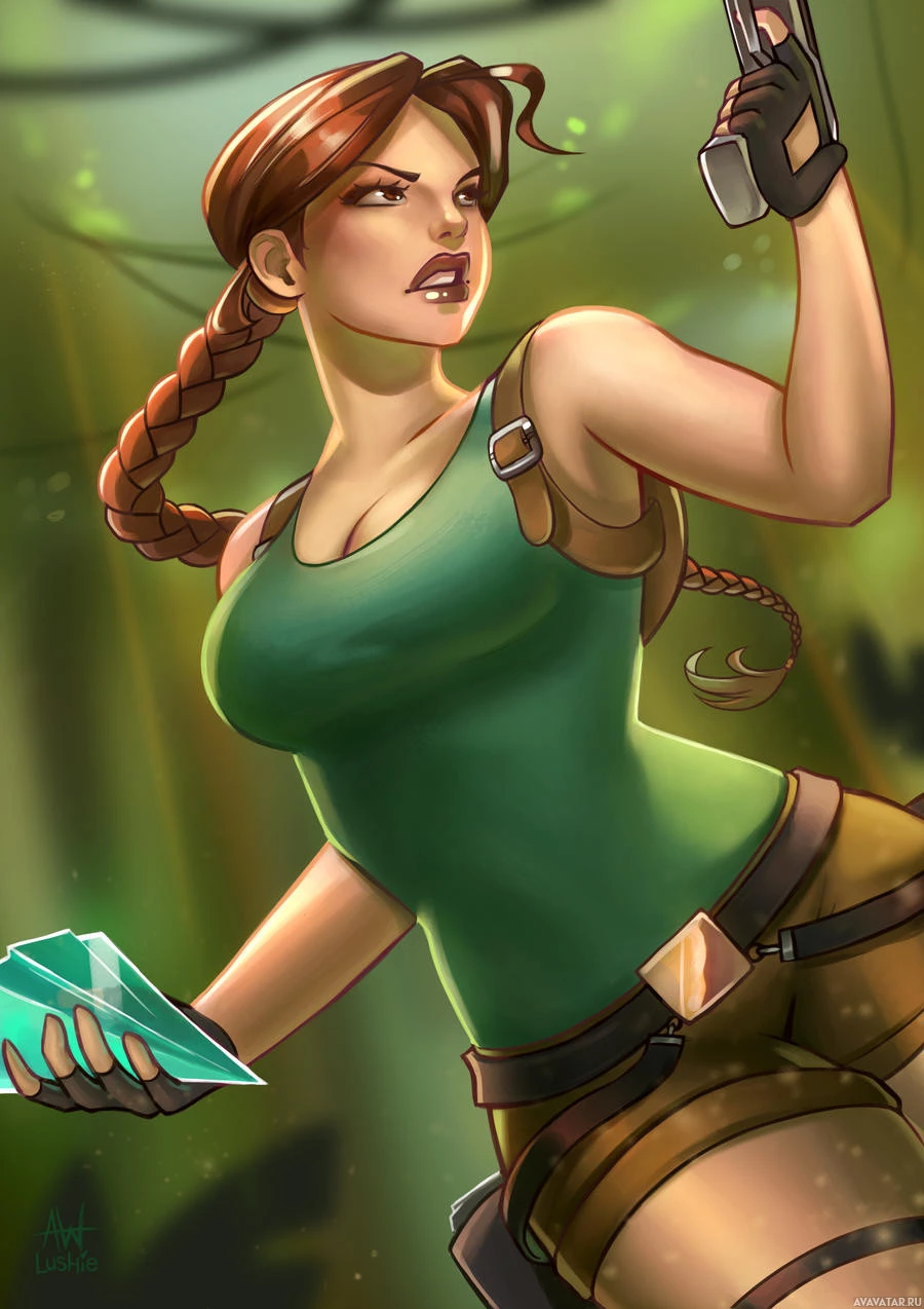 a female character who appears to be Lara Croft, the protagonist from the "Tomb Raider" video game series. She is shown in an adventurous pose, wearing her signature outfit which includes