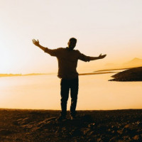 the golden hour. The person is facing towards the water, and their arms are extended upwards as if they are embracing nature or celebrating something. There is a calm