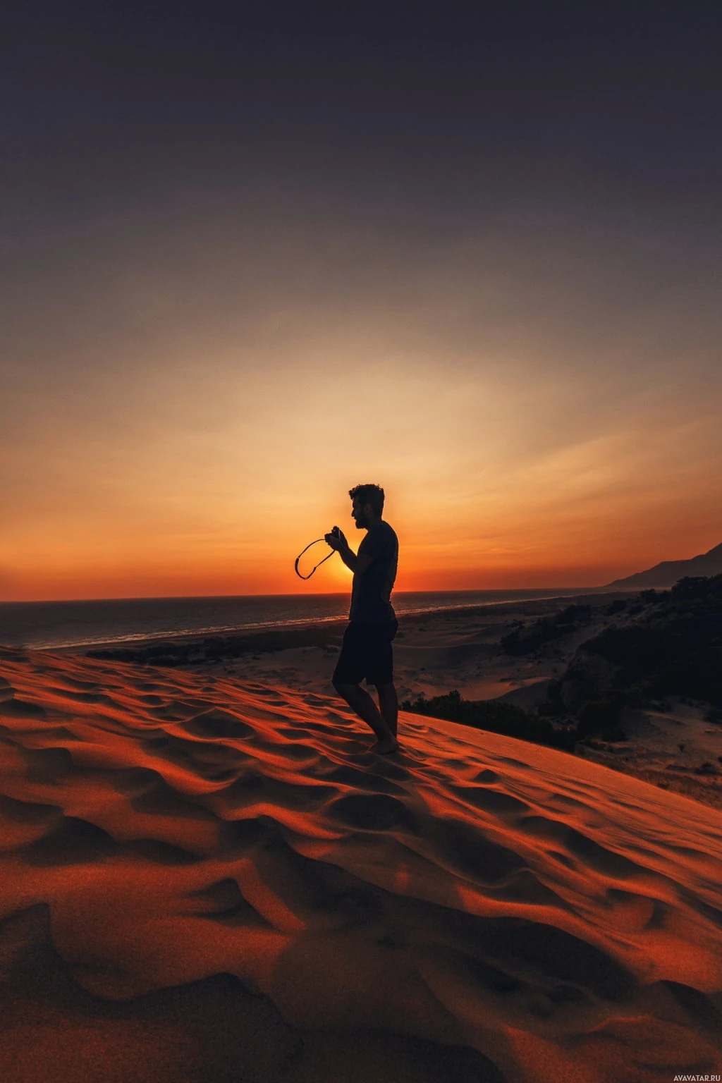 The image shows a person standing on what appears to be a sand dune at either sunrise or sunset, given