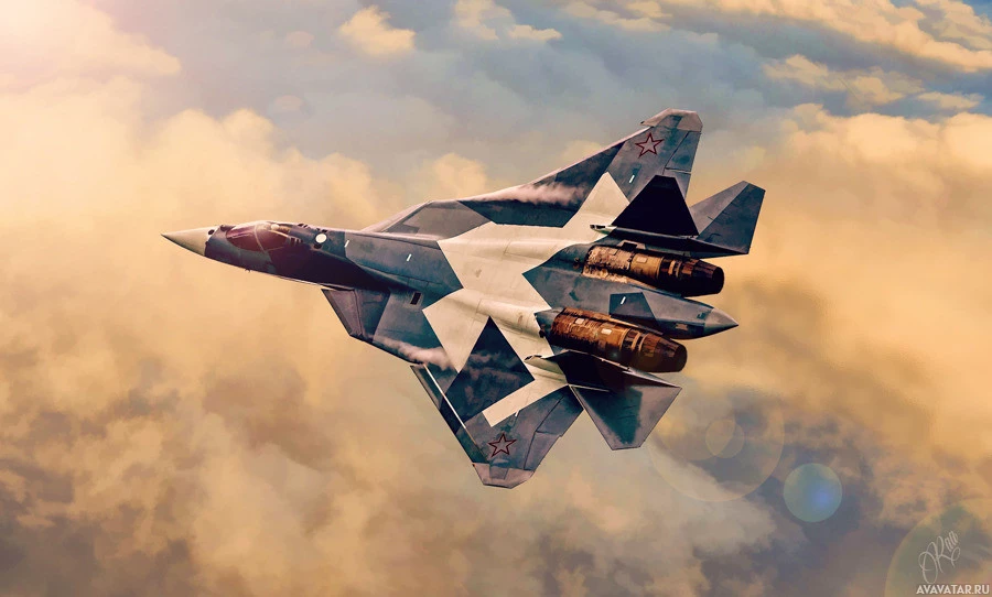 The image shows a military fighter jet in flight against a backdrop of cloudy skies. The aircraft appears to be equipped with air-to-air missiles and has the insignia of the Russian Air Force, indicating it is likely an operational fighter aircraft.
