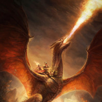 a dramatic setting, possibly a battlefield or a volcanic landscape with smoke and flames. The overall atmosphere conveys intensity and epic proportions, which is often associated with