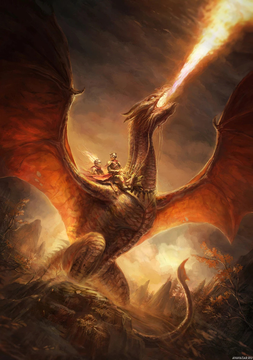 a fantasy scene featuring a dragon. In the foreground, there is a dragon with wings spread wide and its mouth agape, as if it is breathing fire or roaring. Riding on top of this dragon is