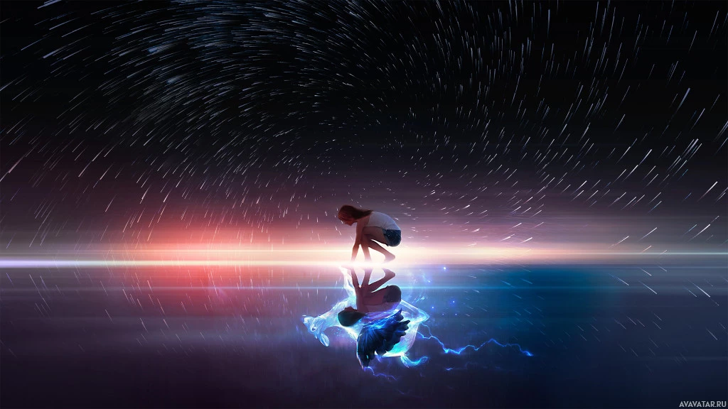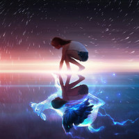 a dynamic scene possibly from an animated movie or video game. There is a dramatic background featuring