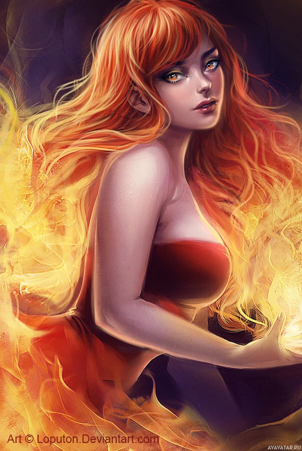 dynamic pose, as if she is embracing or dancing with the flames around her. The background features