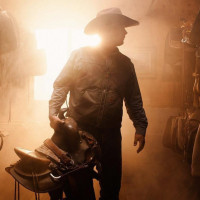 The image shows a silhouette of a man standing in what appears to be a horse stable or a room filled with various saddles and tack. He is wearing a cowboy hat, which suggests that the setting may be related to equestrian activities or the western lifestyle. The focus on the silhouette creates a dramatic effect, emphasizing his presence within this environment.