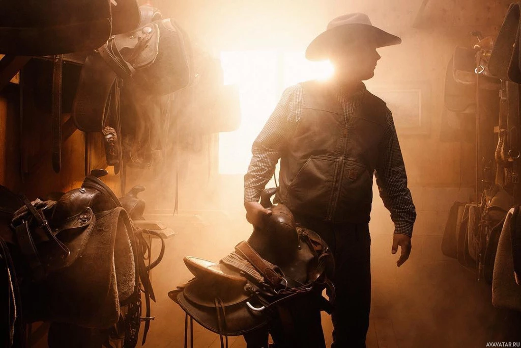 На картинке изображен силуэт человека, стоящего в конюшне или комнате, заполненной различными седлами и стойкой. Он носит ковбойскую шляпу, что говорит о том, что обстановка может быть связана с конной деятельностью или западным образом жизни. Фокус на силуэте создает драматический эффект, подчеркивая его присутствие в этой среде.