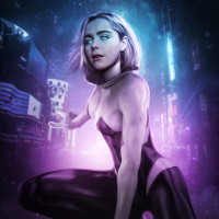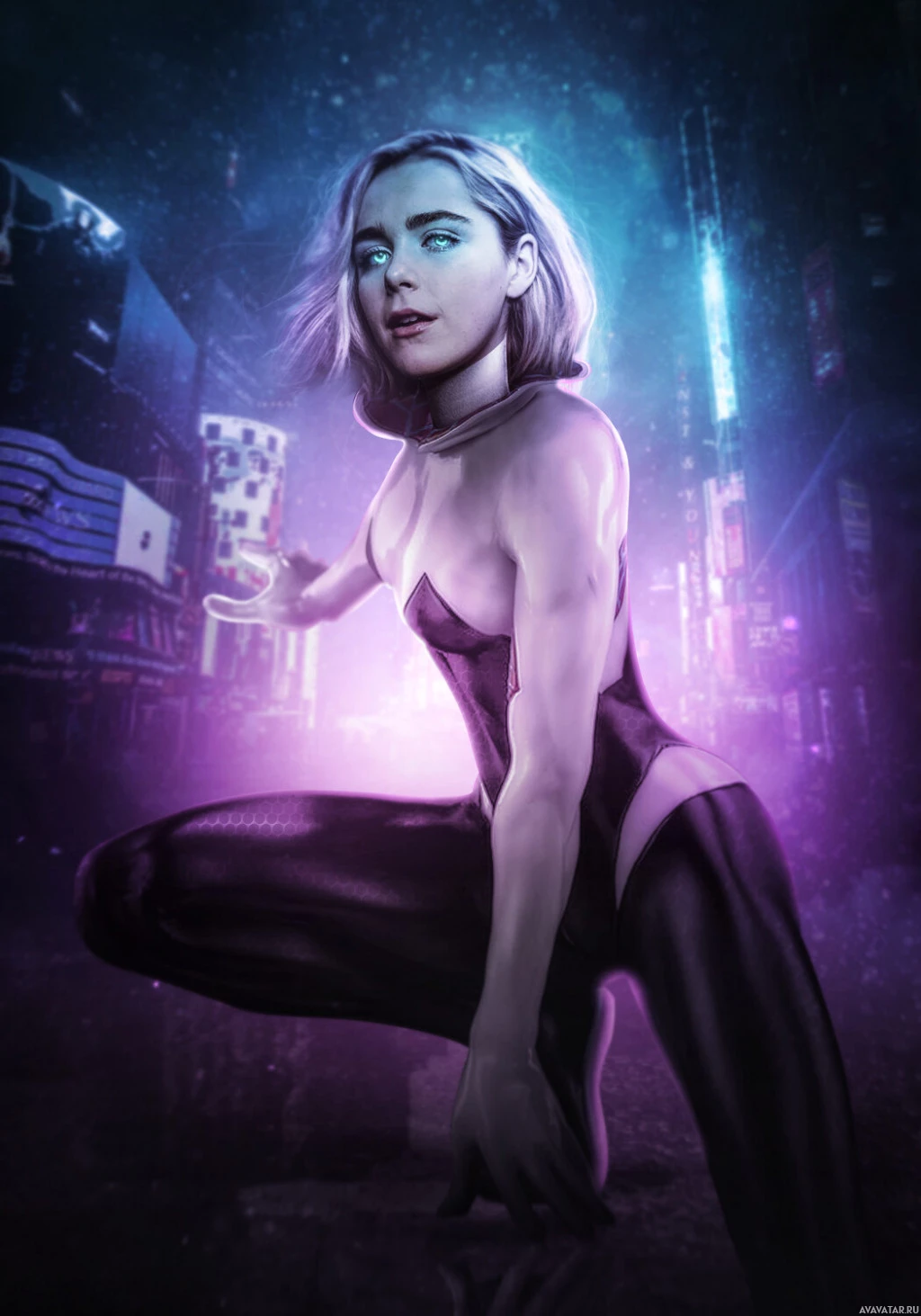 an urban setting with neon lights and futuristic elements, which suggests that this could be a concept for a future version of Gwen Stacy or perhaps a stylized interpretation of her character from another dimension. The character is shown wearing a costume with a bodysuit and cape, which are traditional elements of her