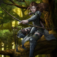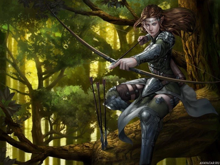 an elf archer. She is wearing armor and holding a bow with a quiver full of arrows on her back. Her attire and the setting suggest she might be in a wooded or forested environment, possibly preparing for battle or engaging in hunting. The artwork is detailed, showing realistic elements like foliage, light filtering through the trees, and textures that give the scene a rich and immersive feel.