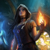 The image depicts a female character in a fantasy setting. She is wearing what appears to be a hood, and she's holding something that resembles fire in her hand. The background suggests an interior space with decorative elements that could indicate a mystical or magical location. The overall aesthetic of the image suggests it may be related to a fantasy-themed game, comic book, or artwork.