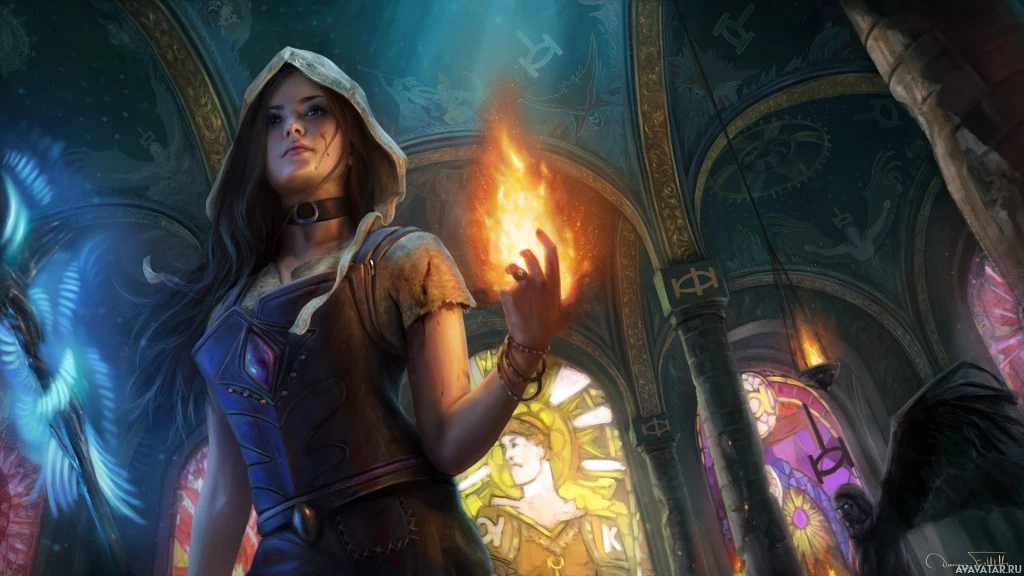 Картинка показывает женского персонажа в фантастической обстановке. Она носит то, что кажется капюшоном, и держит в руке нечто, напоминающее огонь. Фон предполагает внутреннее пространство с декоративными элементами, которые могут указывать на мистическое или магическое местоположение. Общая эстетика изображения предполагает, что оно может быть связано с фэнтезийной игрой, комиксами или произведениями искусства.