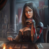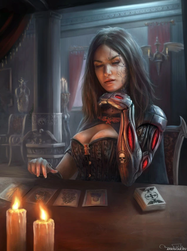 advanced technology integration. The character is seated at a table with cards spread out in front of her, suggesting that she could be involved in