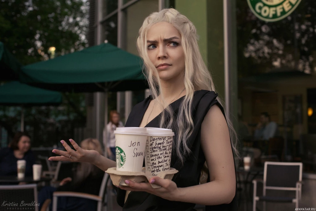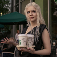 В картине присутствует человек, одетый в косплей, изображающий персонажа Дейенерис из телесериала «Игра престолов». Человек стоит за пределами того, что кажется кофейней Starbucks. Они держат две чашки кофе и удивлены или шокированы выражением лица.