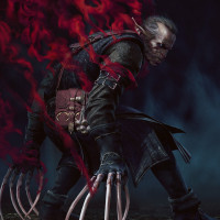 concept art related to the game. The character is shown with an intense expression, surrounded by red smoke, which adds to