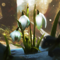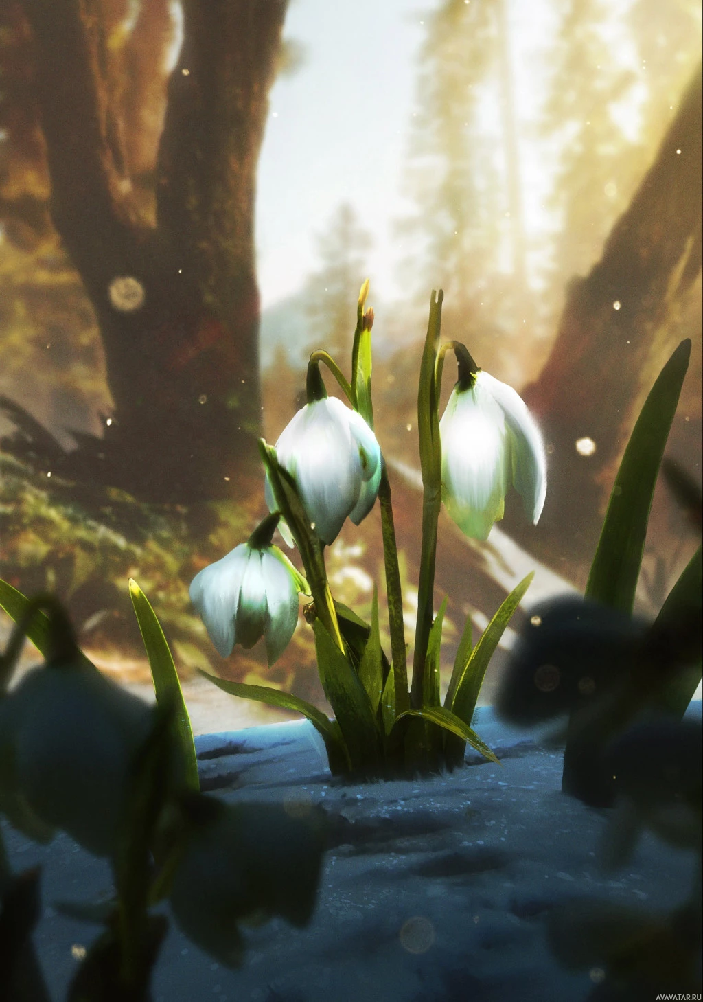 white flowers with long, thin petals are growing amidst what appears to be forest foliage. The lighting suggests it might be