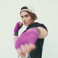 a graphic design, shorts, purple wristbands, and boxing gloves, suggesting she might be involved in the sport or training. The person is posed in