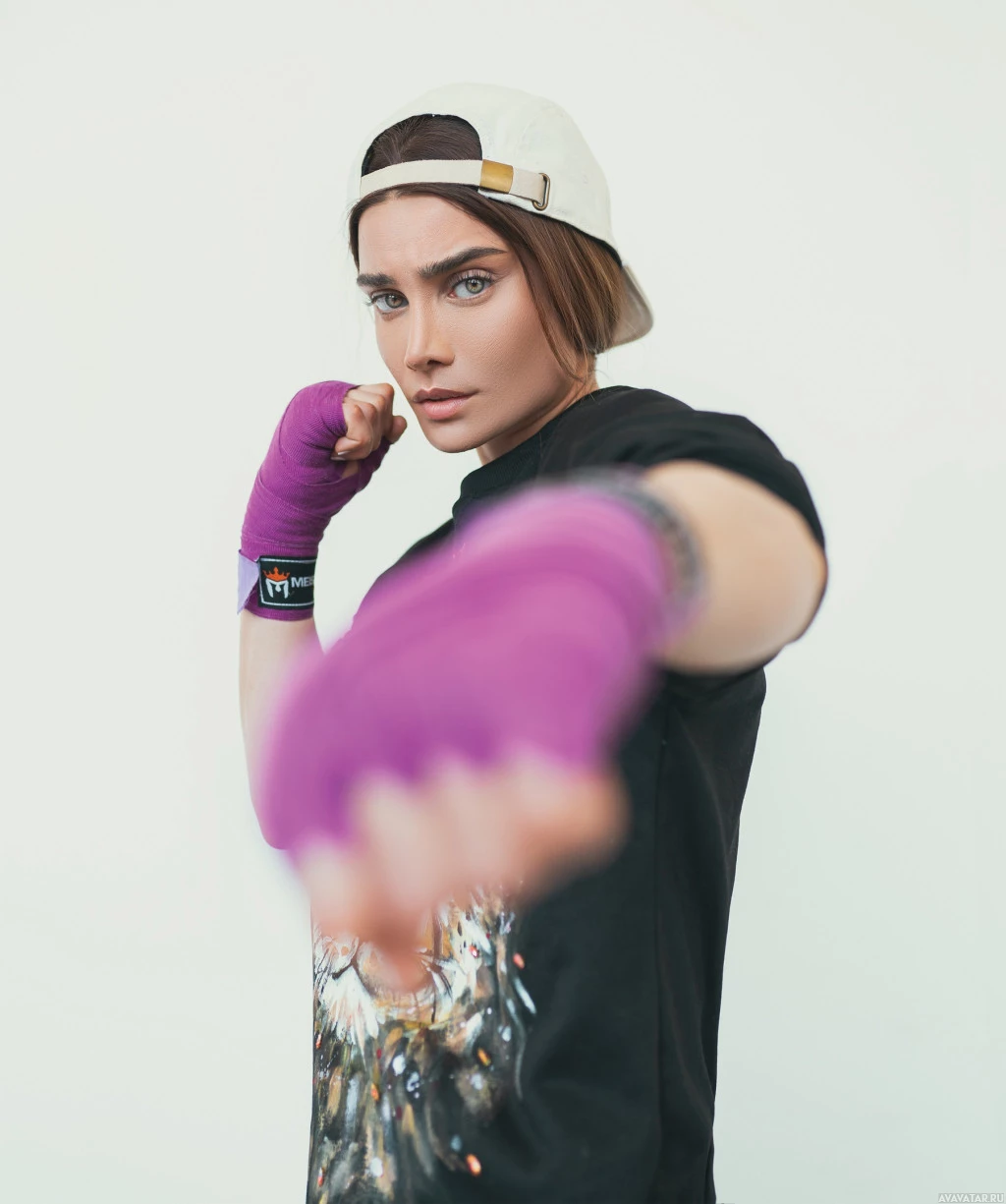 athletic attire suitable for boxing. She is wearing a cap, a t-shirt with