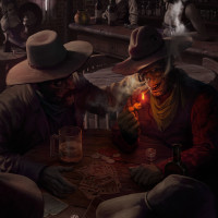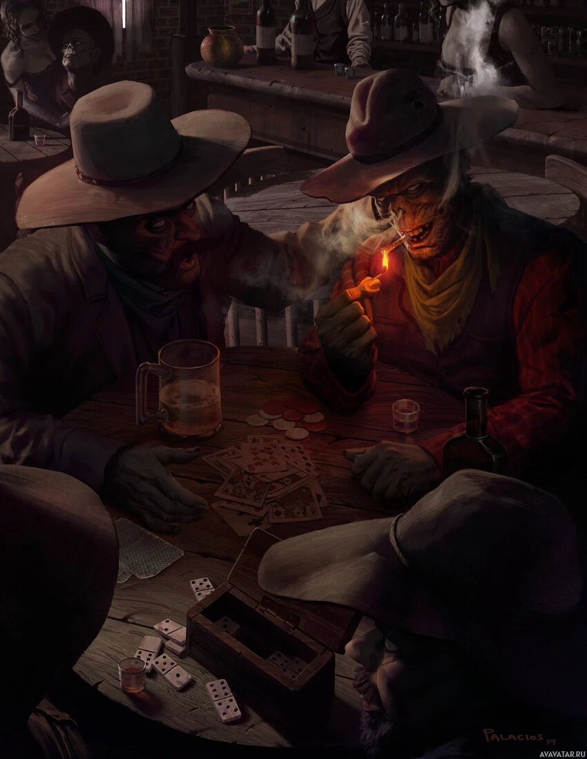 a lit cigarette, and it's possible that this could be interpreted as an image of a zombie due to the context provided; however, without more information, it is not clear if there are any literal zombies present in the image. The setting seems to be a western saloon or bar, indicated by the presence of a table with