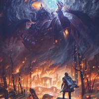 a fiery landscape, possibly after a battle or natural disaster. The background shows two characters interacting: one appears to be in
