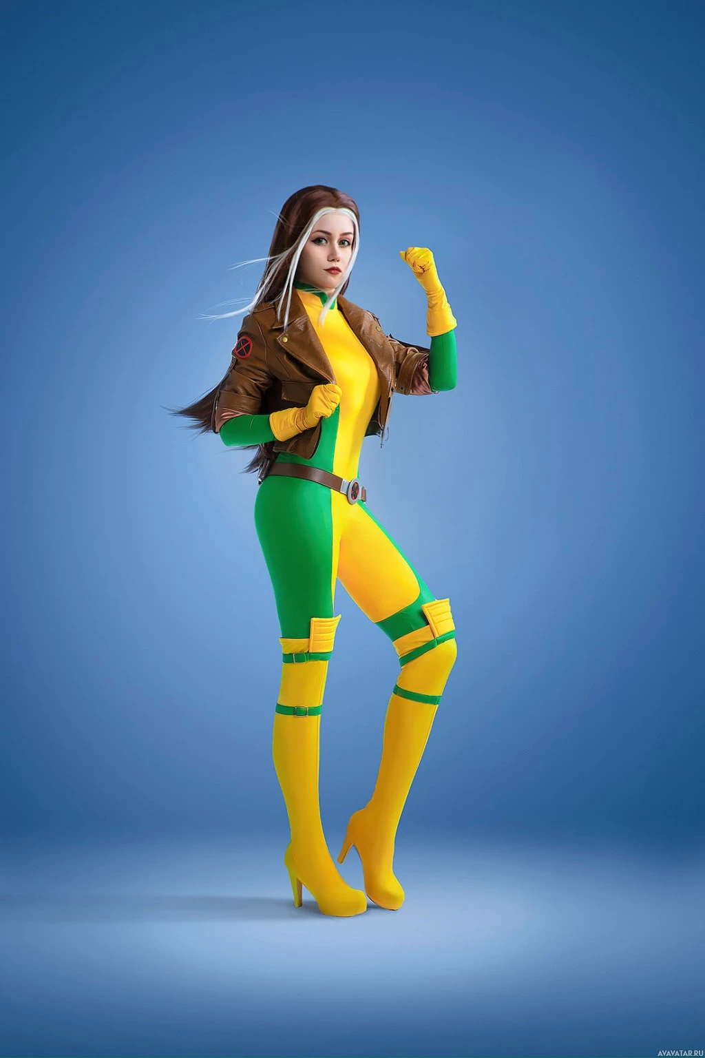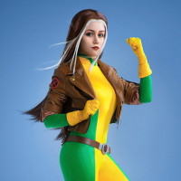 leather jacket, green body suit, yellow gloves, and boots, which are typical attire for Rogue when portrayed in her superhero guise.