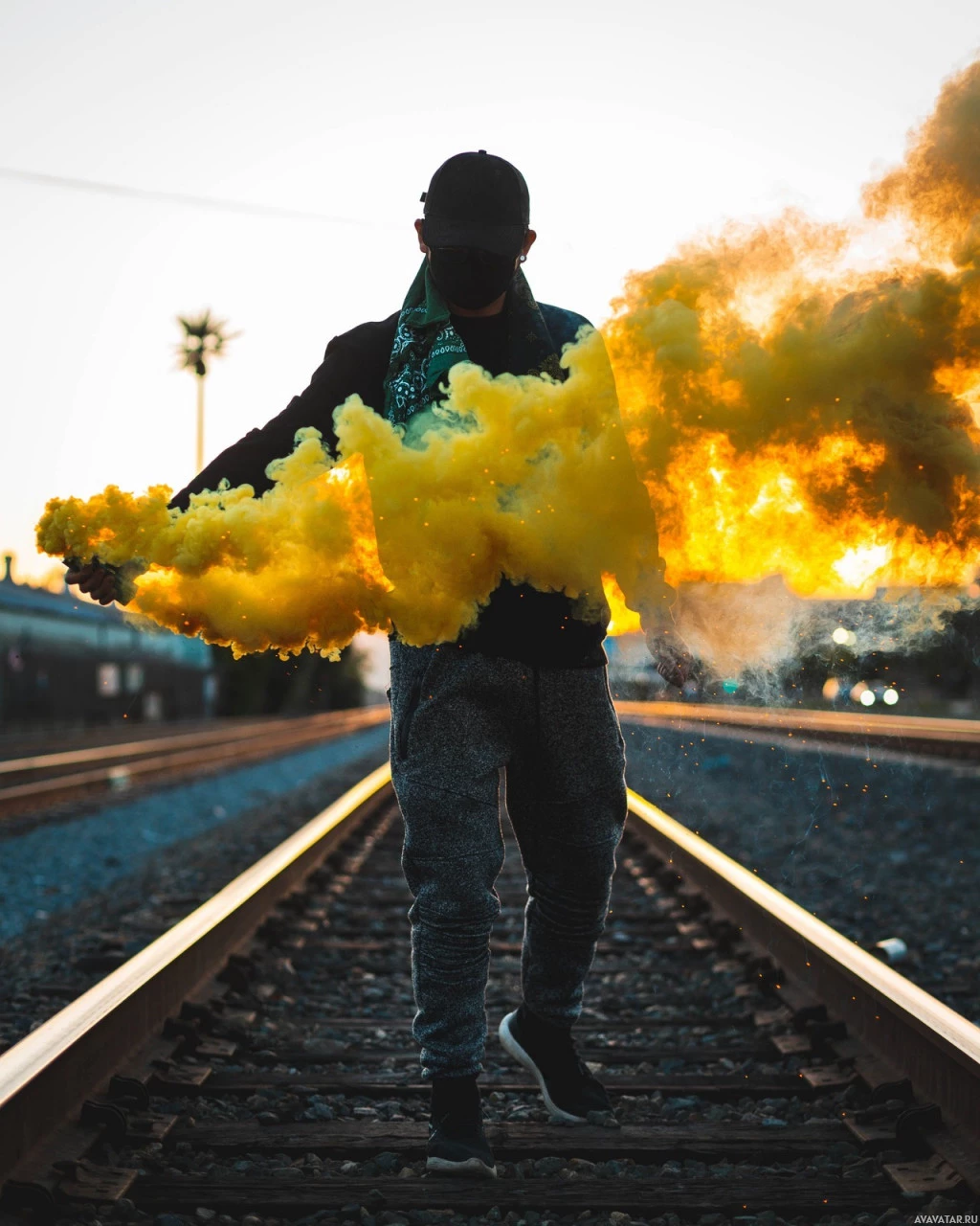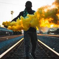 artistic act. They are walking along the railroad tracks, with smoke billowing from their hands, which creates an interesting