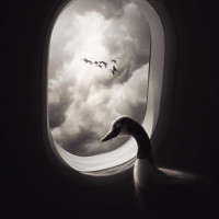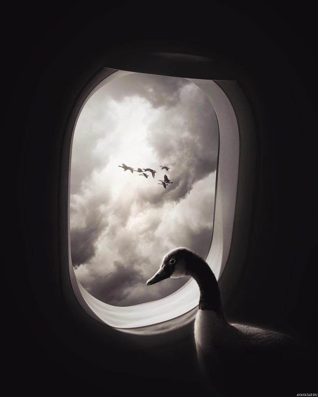 a high altitude. Outside the window, there are birds visible in flight. Inside the plane cabin, there is one duck sitting calmly on the floor next to the window, looking out at