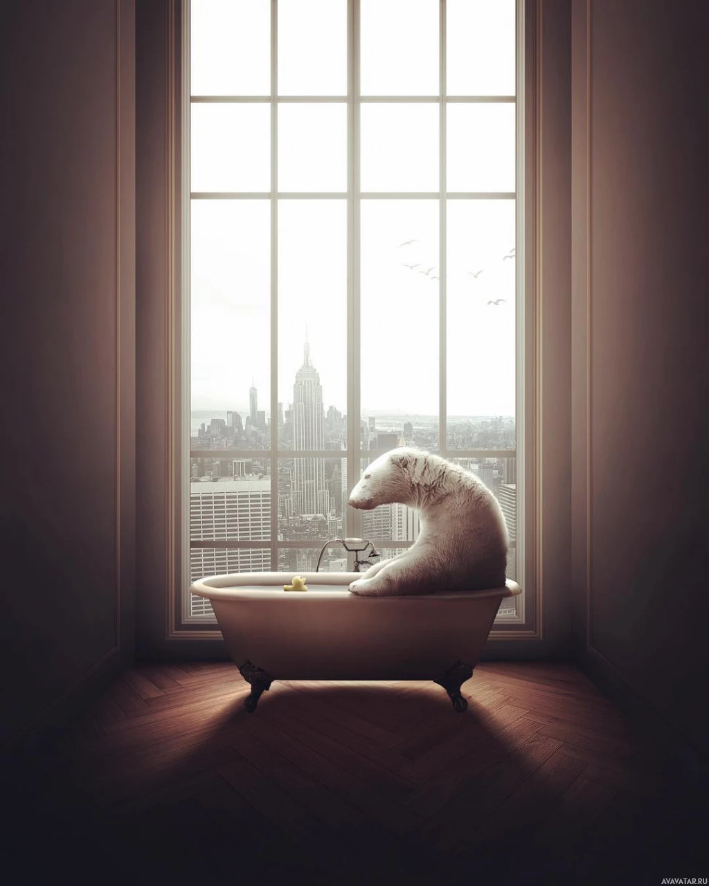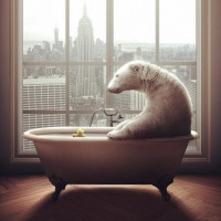 a white bear sitting in a bathtub. It appears to be a whimsical and surreal scene, as bears are not typically associated with such human-like activities. The background features city skylines with the Statue of Liberty visible among other tall buildings, suggesting